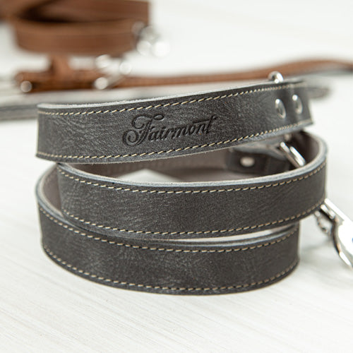 Choyez votre animal avec cette laisse robuste conçue pour Fairmont par Roots. La laisse en cuir italien véritable de Roots est conçue et fabriquée à la main au Canada. Nos ambassadeurs canins se promènent l'après-midi et font la sieste en portant nos colliers et laisses élégants.