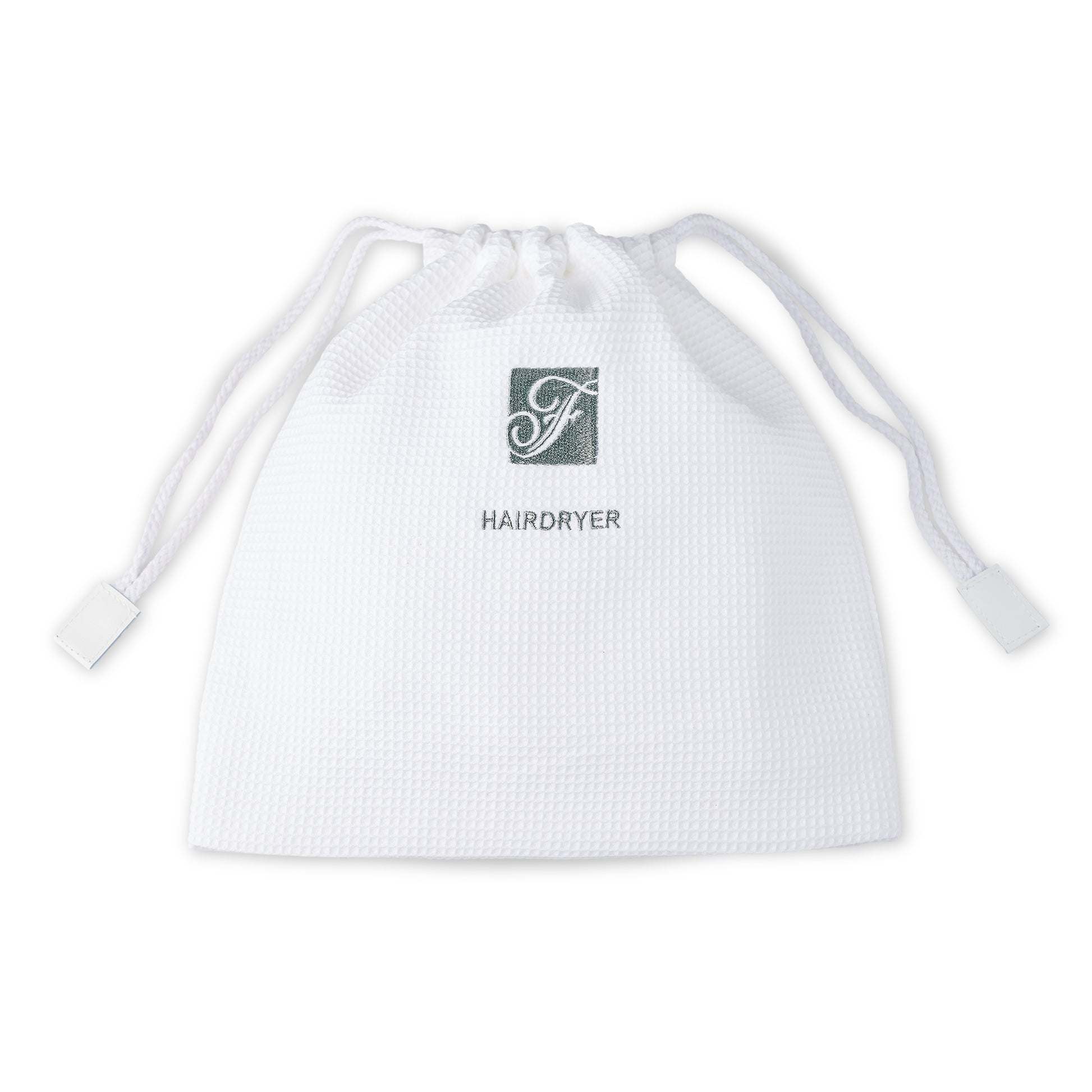 The Fairmont embroidered Hair Dryer Bag is the perfect travel companion for your hair dryer. This waffle-patterned bag is 100% polyester and a perfect hair bag for transporting your hair dryer. It's small enough to fit into your bathroom cabinet, and is the perfect way to keep your blow dryer organized and dust free.