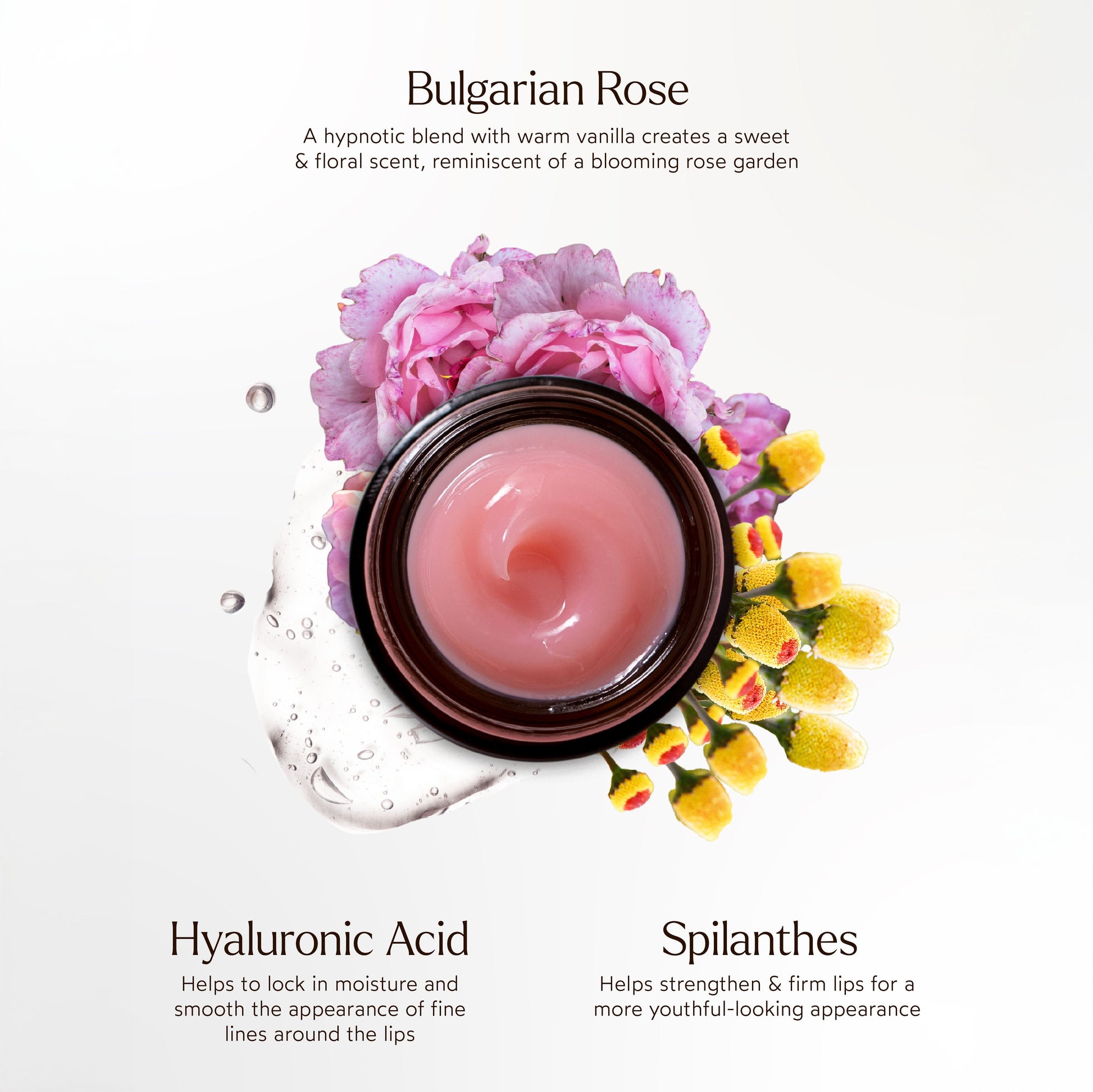 Give your lips the care they deserve with this nourishing, anti-aging balm. Packed with soft butters, oils, and two molecular sizes of hydrating Hyaluronic Acid, it instantly softens lip lines while Spilanthes helps firm and strengthen for a youthful appearance. With its creamy texture and natural glossy finish, this balm protects, prevents, and corrects signs of aging—leaving your lips soft, smooth, and irresistibly glossy.