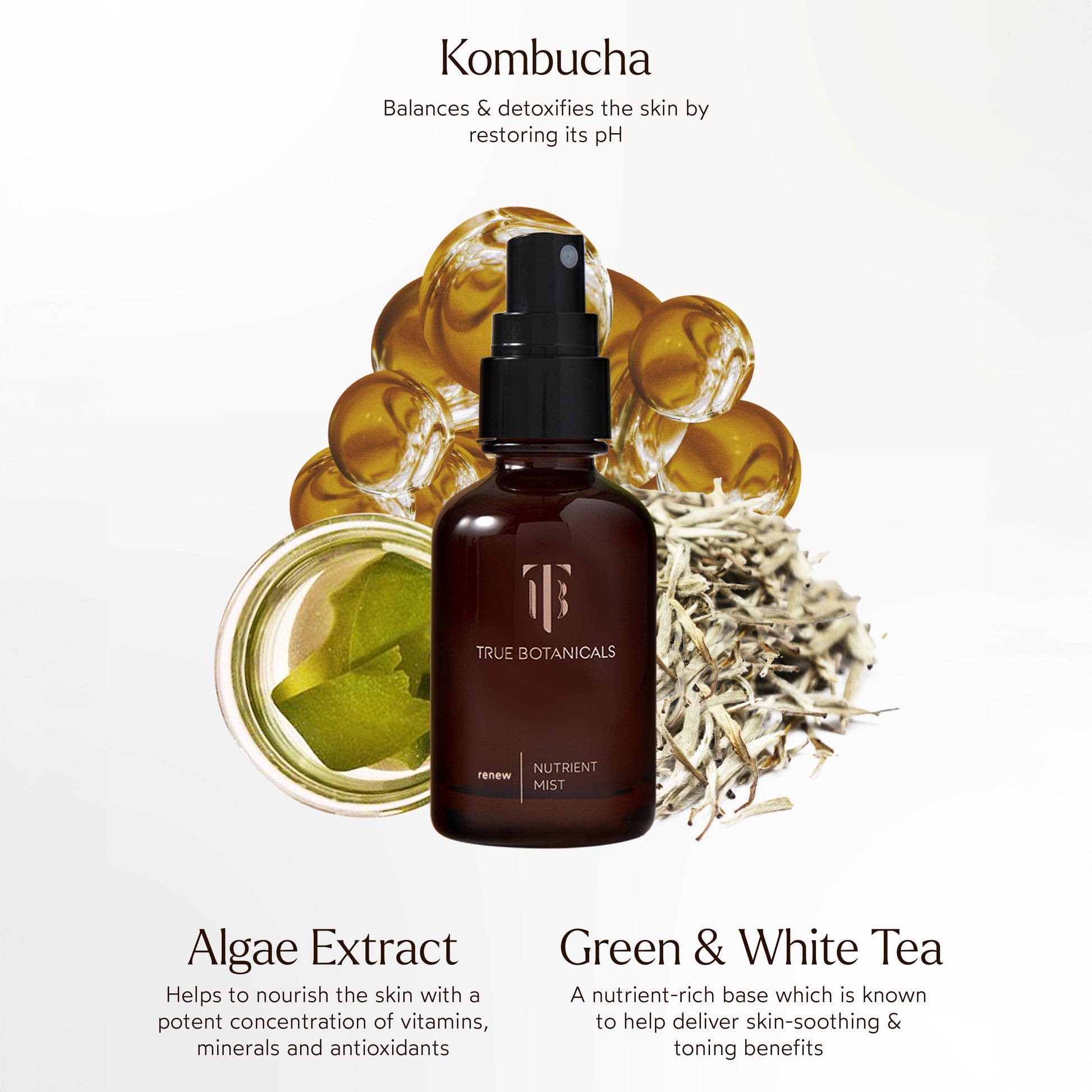 Like a daily multi-vitamin for your skin, this ultra-hydrating face mist quenches and refreshes skin with a burst of natural botanicals. Formulated with Antioxidants, Algae Extract, and Kombucha, this mist protects skin from environmental aggressors while preventing water loss-giving skin a beautiful, youthful glow. And as an added bonus, it also sets makeup.